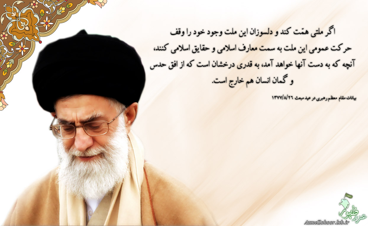 آن وقت چه اتفاقى مىافتد؟ مسیر تاریخ دنیا تغییر پیدا خواهد کرد؛ مسیر تاریخ عوض خواهد شد. امروز مسیر تاریخ، مسیر ظلم است؛ مسیر سلطهگرى و سلطهپذیرى است؛ یک عده در دنیا سلطهگرند، یک عده در دنیا سلطهپذیرند. اگر حرف شما ملت ایران پیش رفت، اگر شما توانستید پیروز شوید، به آن نقطهى موعود برسید، آن وقت مسیر تاریخ عوض خواهد شد؛ زمینهى ظهور ولىّامر و ولىّعصر (ارواحنا له الفداء) آماده خواهد شد؛ دنیا وارد یک مرحلهى جدیدى خواهد شد. این بسته به عزم امروز من و شماست، این بسته به معرفت امروز من و شماست.